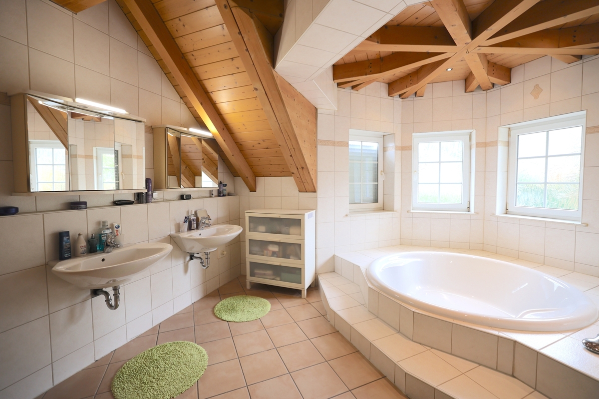 Der geräumige Flur im Obergeschoss verbindet drei helle, freundliche Zimmer, die individuell als Schlaf-, Kinder- oder Arbeitszimmer genutzt werden können. Das große Schlafzimmer bietet viel Platz zum Träumen und Ankommen. Das stilvolle Badezimmer überzeugt mit einer eleganten Eckbadewanne und einer separaten Dusche – eine kleine Wellnessoase im eigenen Zuhause.