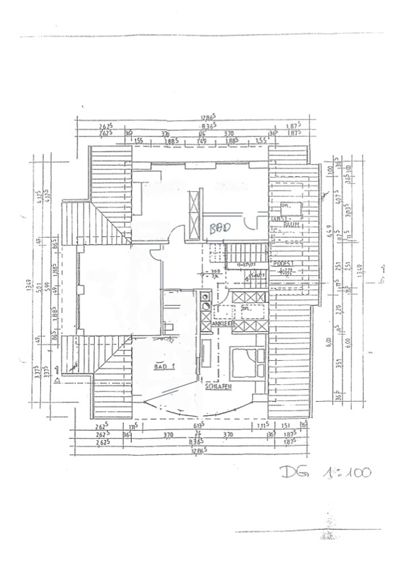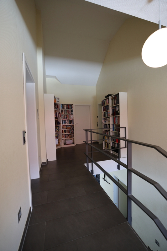 Vom Treppenhaus gelangen Sie in eine dachhohe Diele, von welchem der Bereich des Elternschlafzimmers, des Kinderzimmers und eines weiteren Zimmers abgeht.