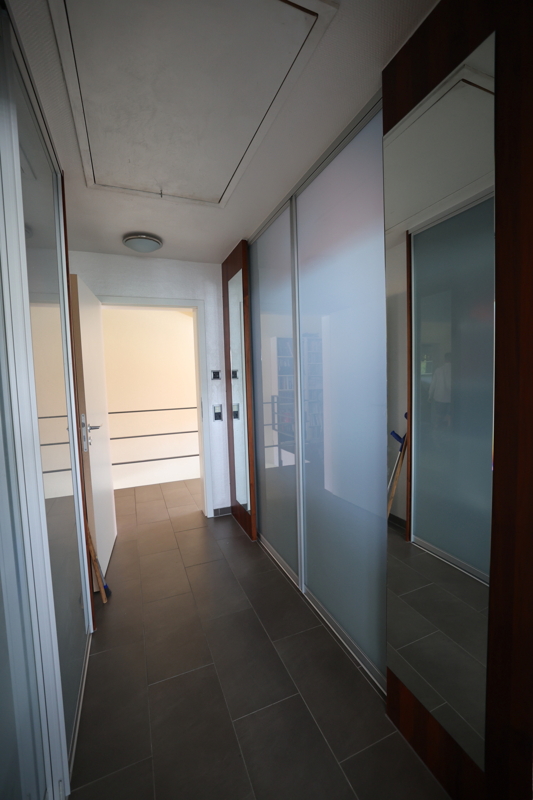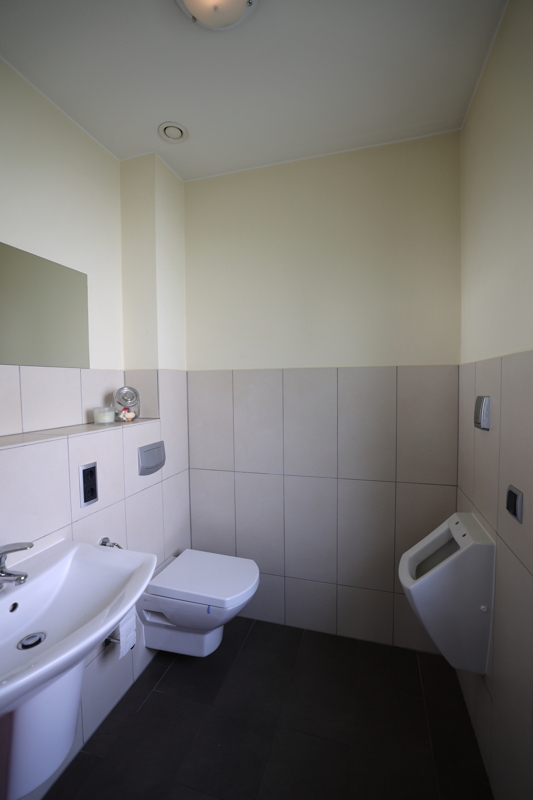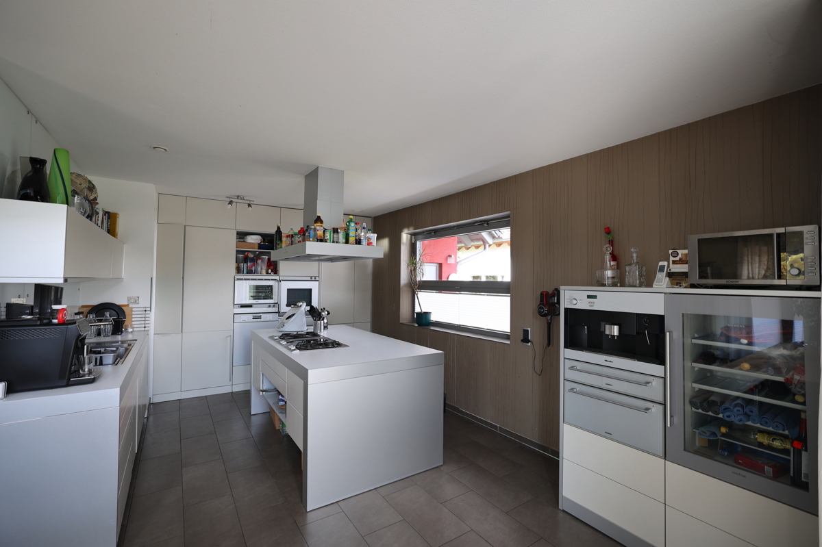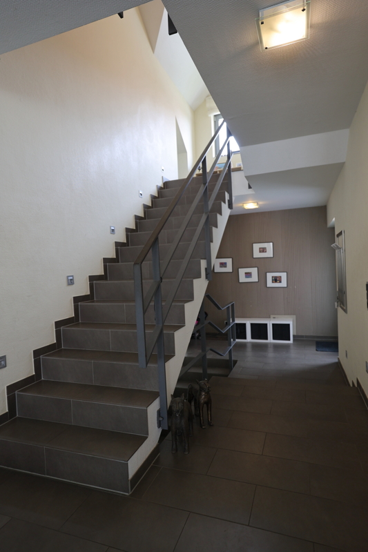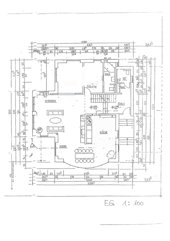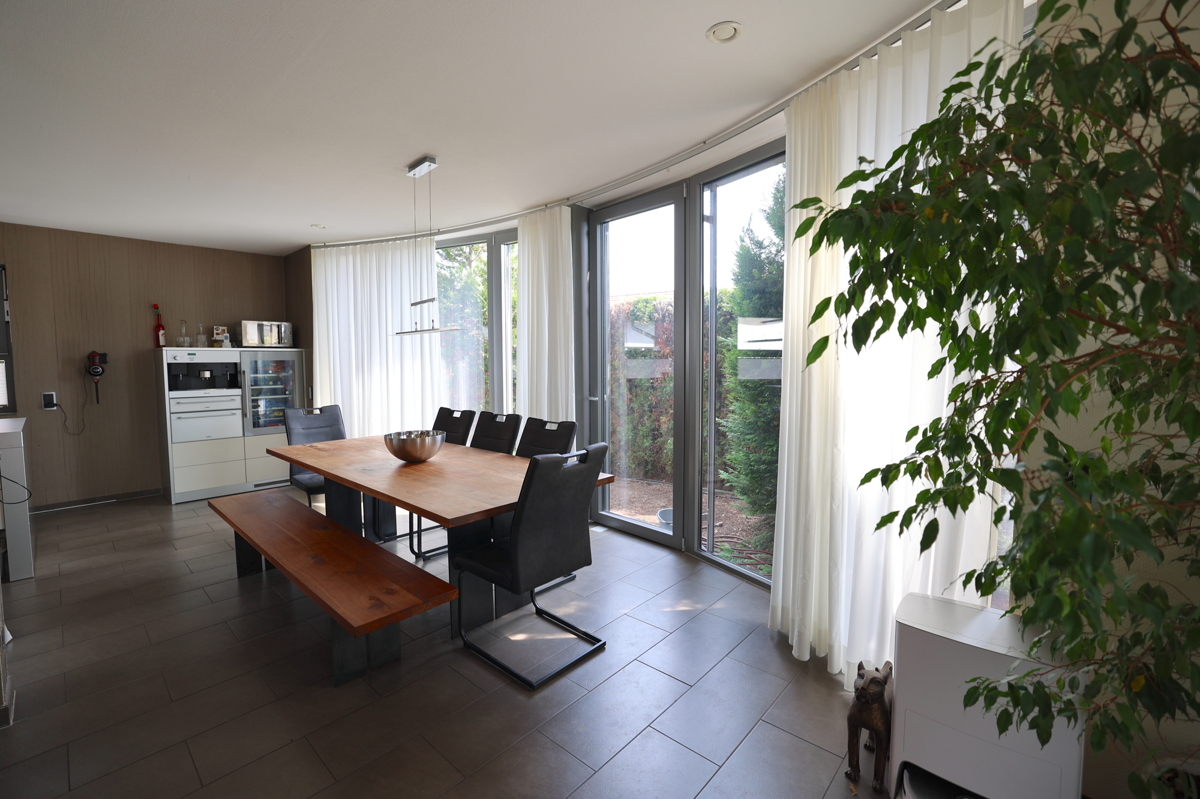 Im Eingangsbereich finden Sie neben einer Garderobe ein voll ausgestattetes Gäste-WC (WC, Pissoir und Waschbecken), desweiteren das Treppenhaus, welches sich zu einem großzügigen Wohnzimmer mit Kaminofen öffnet. Getrennt durch eine Glasschiebetür betreten Sie ein Esszimmer mit offener Küche; derzeit eine Bulthaupt Küche mit Gaggenau Geräten.