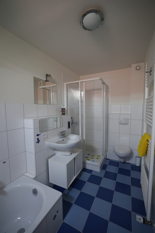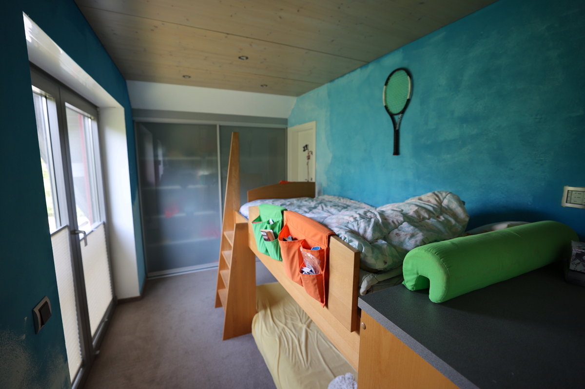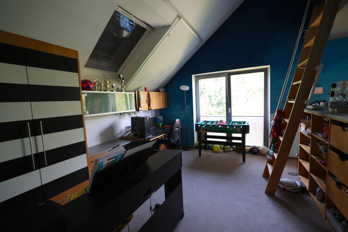 Das Kinderzimmer ist vollständig mit Einbauschränken und Regalen, inklusive Bett, und Schreibtisch ausgestattet. Im Kinderzimmer befindet sich eine liebevoll gestaltete Galerie im Dachgeschoss, die als Lego-Ecke, oder für ältere Kinder als Schlafstätte wunderbar genutzt werden kann. Zudem gibt es im Anschluss an das Kinderzimmer ebenfalls ein vollausgestattetes Badezimmer (Dusche, WC, Waschbecken und Badewanne)
