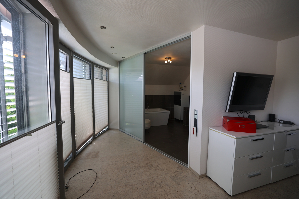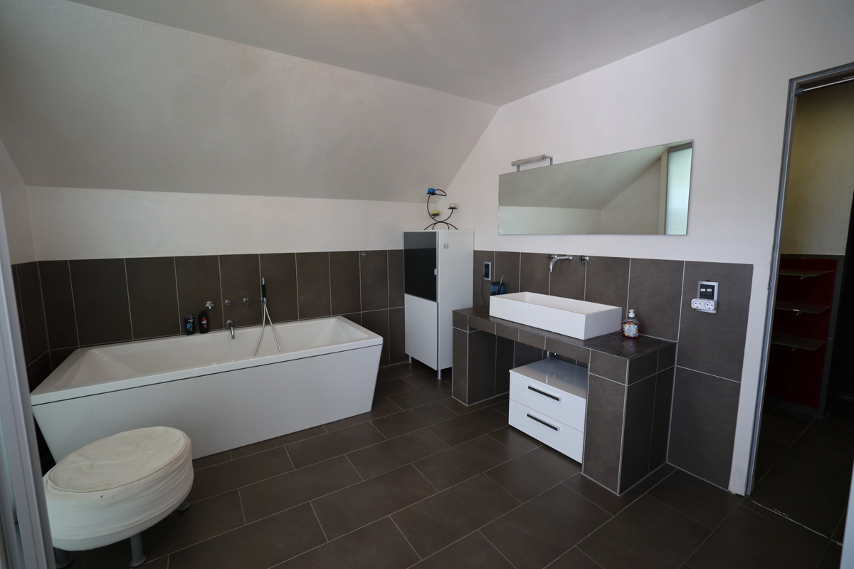 Im Durchgang zum Elternschlafzimmer befindet sich eine großzügige Ankleide mit begehbarem eingebautem Kleiderschrank. Im Anschluss an das Elternschlafzimmer betreten Sie ein luxuriöses Bad. Die elegante, begehbare Dusche und die freistehende Badewanne laden zu entspannten Momenten ein.